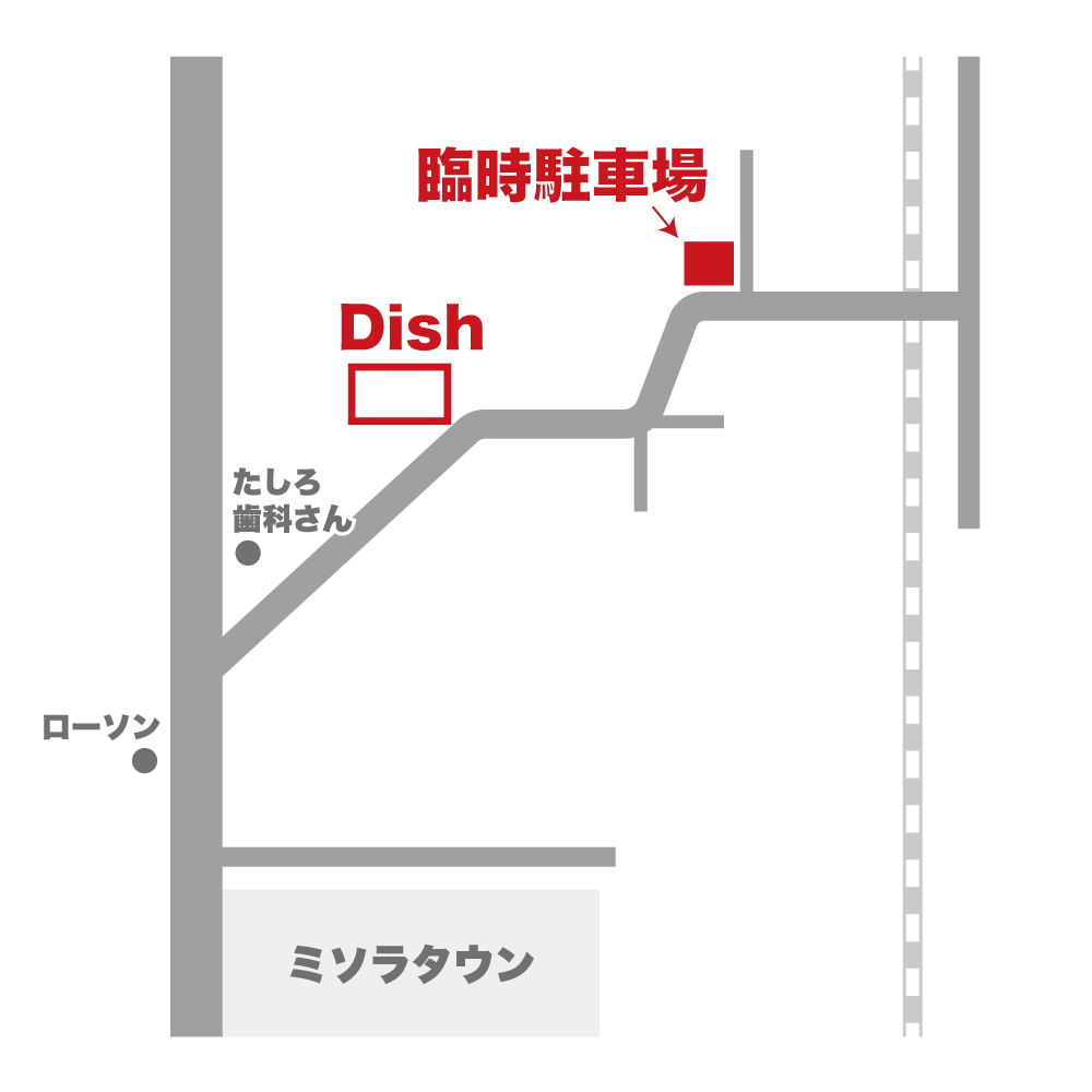 ○駐車場は、Dish店舗内または、臨時駐車場をご利用ください。